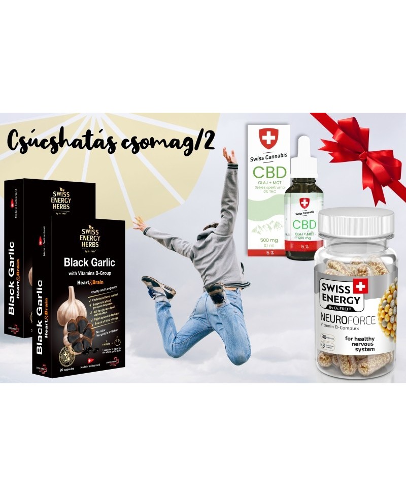 1 db Swiss Cannabis CBD+MCT olaj 5% - 500mg/10ml + 2 doboz Swiss Energy Fekete fokhagyma kivonat + 1 doboz Swiss Energy Neuroforce